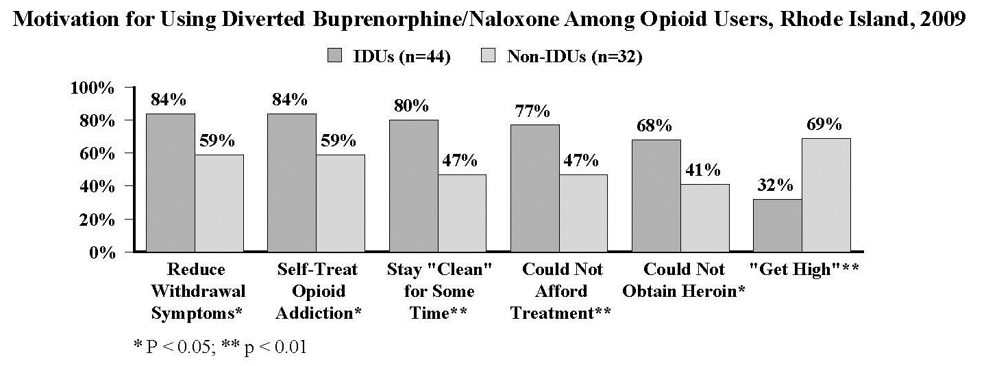 The authors suggest that these differences may be because IDUs have a greater severity of dependence—they were more likely to report high frequency opioid use, a history of enrollment in methadone maintenance treatment, and utilization of detoxification services. The authors also note that “The number of opioid users in our sample who reported having ever used buprenorphine/naloxone to ‘get high’ is surprising, given that buprenorphine/naloxone is a partial opioid agonist that is not expected to produce euphoria in regular users with a tolerance to opioids. It is possible that some participants, particularly noninjecting opioid users, did not use opioids regularly enough to develop significant tolerance” (p. 5).