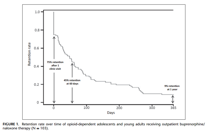 We submit these retention rates as preliminary benchmarks against which other approaches might be compared. Considering the chronic relapsing nature of addiction, long-term opioid substitution therapy with BUP/NAL should gain wider acceptance. Outpatient BUP/NAL should be seen as an important component of adolescent and young adult opioid addiction treatment.