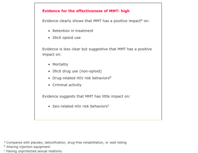 116 Fullerton CA, Kim M, Thomas CP, et al. Medication-assisted treatment with methadone: assessing the evidence. Psychiatric Services. 2014 Feb 1;65(2):146-57. doi: 10.1176/appi.ps.201300235.
