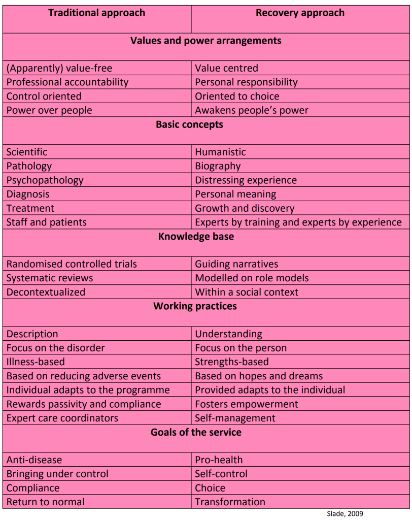 I don’t know if these are the right lines for distinguishing a recovery orientation from other approaches but, as recovery is increasingly destabilized in professional and advocacy circles, it seems worth revisiting.
