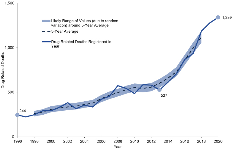 The Road to Recovery was published in 2008. Drug-related deaths were on a gradually increasing trajectory before then. From the year of publication of R2R to 2010, drug related deaths actually declined before climbing gradually from 2010 to 2013 when they really took off, so it’s quite hard to link the policy directly to increasing drug deaths.