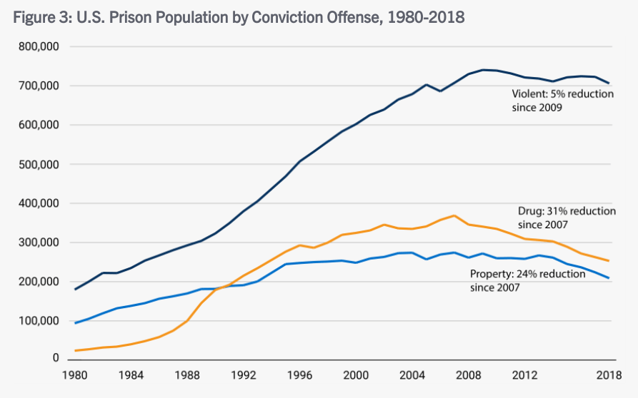 I’m not a believer that the CRBD necessarily leads to less stigma and better policy, and I won’t suggest that the CRBD is responsible for any changes in policy. However, the argument that the CRBD model is associated with incarceration is undermined by trends in incarceration for drug crimes. Even if the CRBD model could deliver significant policy and cultural change, that would take time — years, probably many years. The chart below shows a leveling off and eventual decline of people incarcerated for drug crimes during the period discussed. It’s still too many people incarcerated and those people are disproportionately African American but, if we want to assert an association between the CRBD and incarceration rates, the association would be a downward trend in drug crime incarcerations.