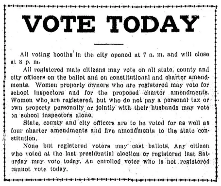 In the April 7, 1913 Detroit News, a short piece describes who can vote in that day’s election, in which women’s suffrage was on the ballot.