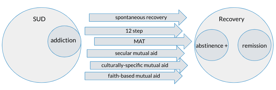 Both programs characterize recovery as requiring abstinence plus a change in behaviors and attitudes. (Which makes it simultaneously a process and an outcome.) Some people have used this as the foundation for describing “better than well” recovery where the person with the addiction achieves much more than remission. The experience of recovering from a seemingly hopeless condition through a new way of life and fellowship might be framed as something akin to post-traumatic growth. (For the rest of the post, I’ll refer to this as abstinence+.)