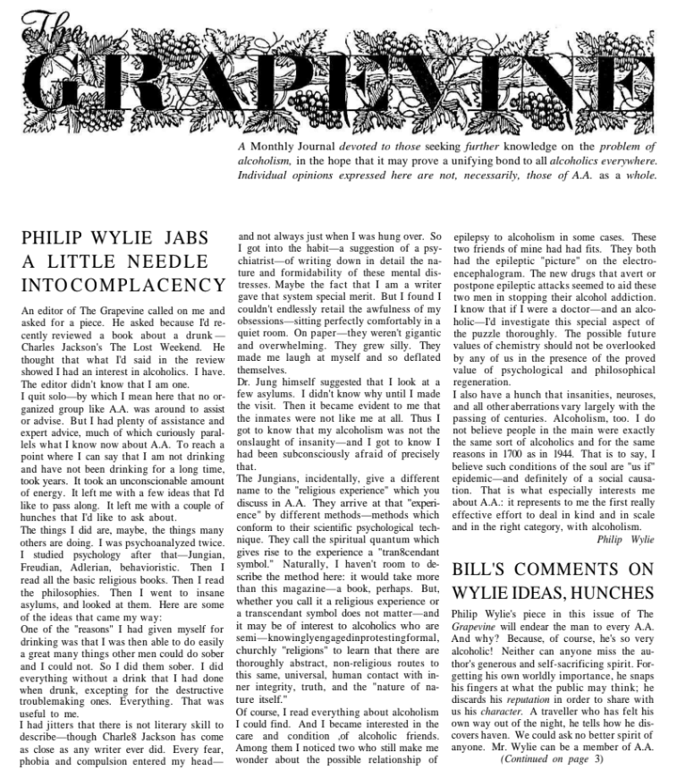 The September 1944 issue of Alcoholics Anonymous’ Grapevine published an article by Philip Wylie, describing his solo recovery supported by psychologists and reading.