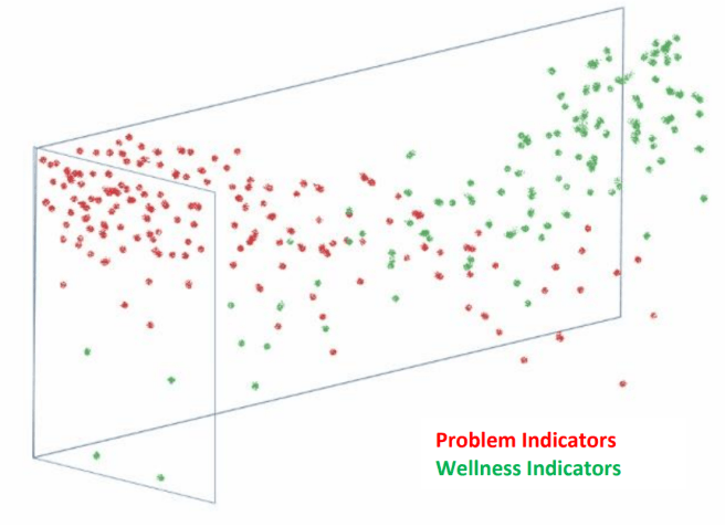 “5 years” is the answer to the question: “When does present sobriety/remission predict lifetime sobriety/remission?” The starting point for the clinician is the universal benchmark of sustained remission and improving quality of life five years after the last clinical touch. As shown, during the five years of care, the active problem indicators are becoming fewer and are falling. And the active wellness indicators are increasing in number and are rising. At the start some wellness indicators are present. And at five years some problem indicators are still present.