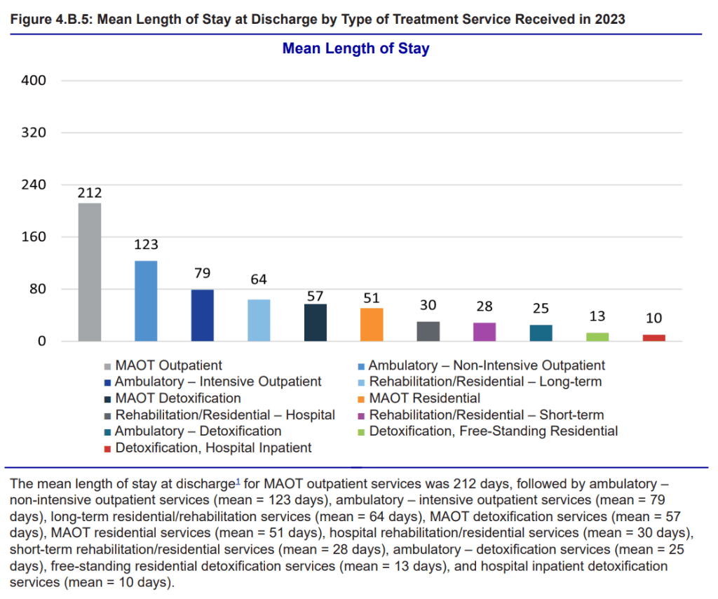 It’s very clear we have a very long way to go, given that 90 days is the benchmark for the minimum effective dose for addiction treatment (which is probably too short), and remission isn’t considered durable until 5 years of continuous recovery.