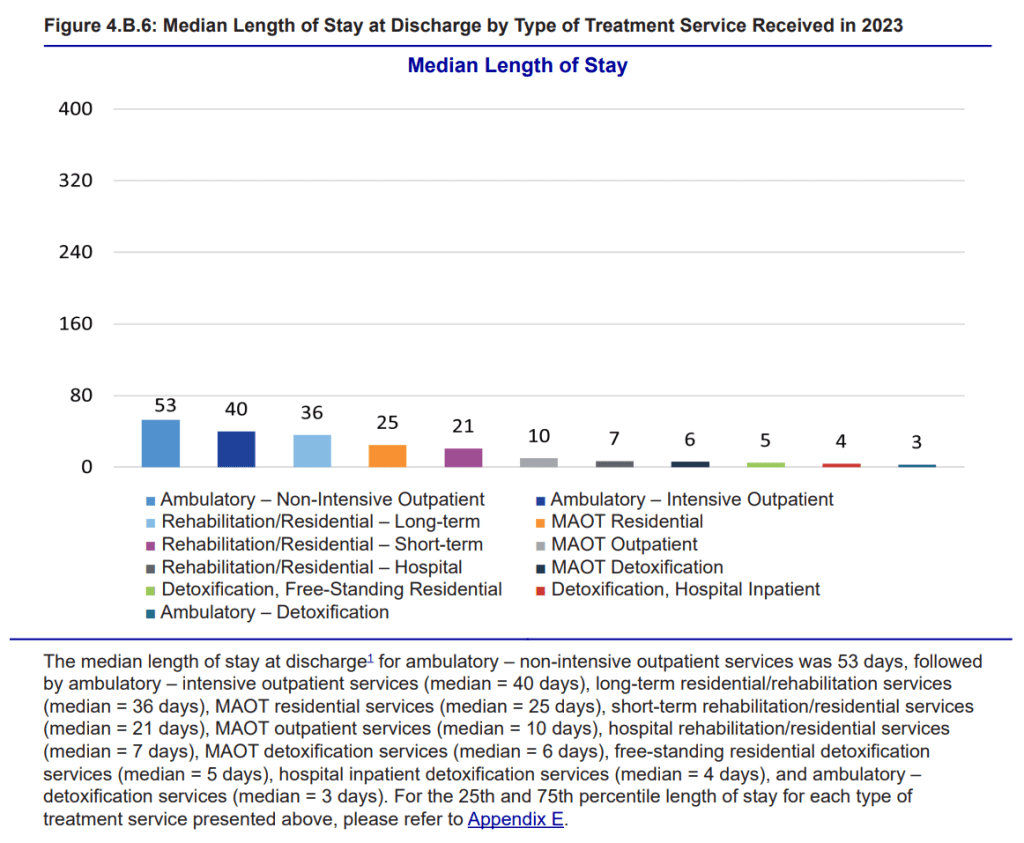 212 days for Medication-Assisted Opioid Therapy – Outpatient is pretty good, given the retention problems we often see in research. However, these numbers include people who have been in treatment for up to 17 years (6205 days).